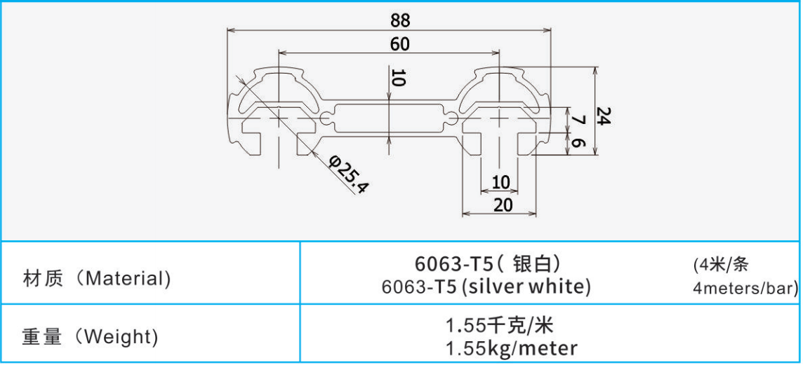 線棒材質:6063-T5(銀白)(4米/條)